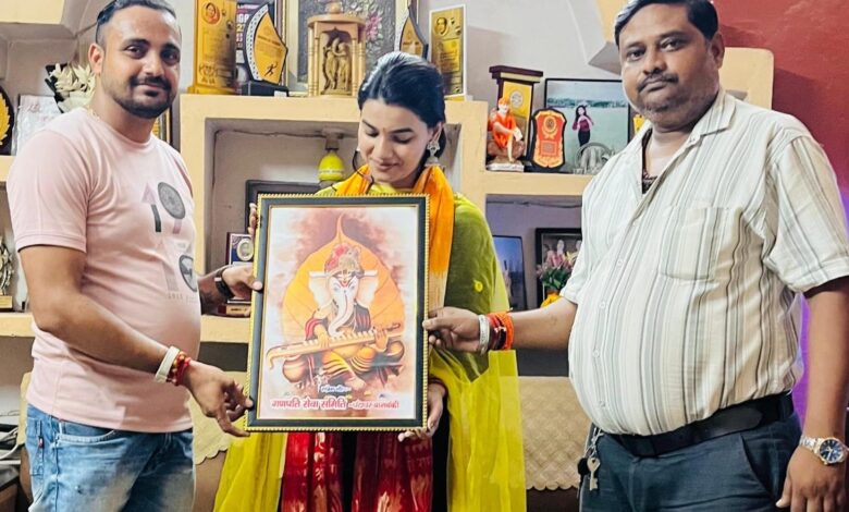 गुरुवार को समिति अध्यक्ष अभिषेक सोनी व कोषाध्यक्ष मोनू साहू ने संयुक्त रूप से तान्या भारद्वाज के आवास पर अंग वस्त्र,प्रसाद व बप्पा का सितार युक्त भव्य स्मृति चिन्ह देकर सम्मानित किया।
